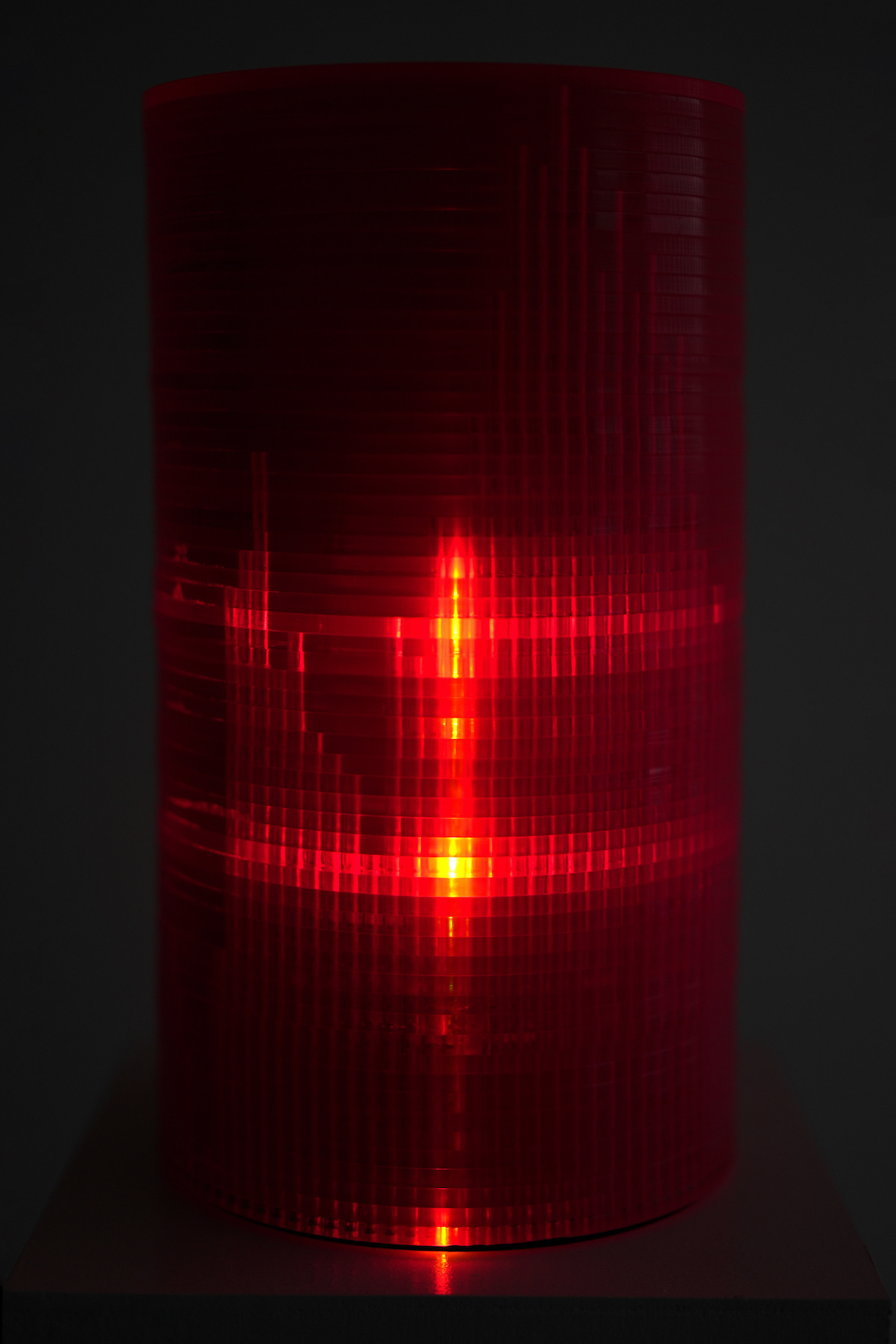 レーザーカッターで貫通孔をあけた蛍光アクリル板を重ねて回転台に乗せ、底面の1点から垂直上向きにレーザーで照射した。数枚分の穴を貫通したレーザー光は行き止まりのアクリル板底面に当たり、その板のフチが強く発光する仕掛け。