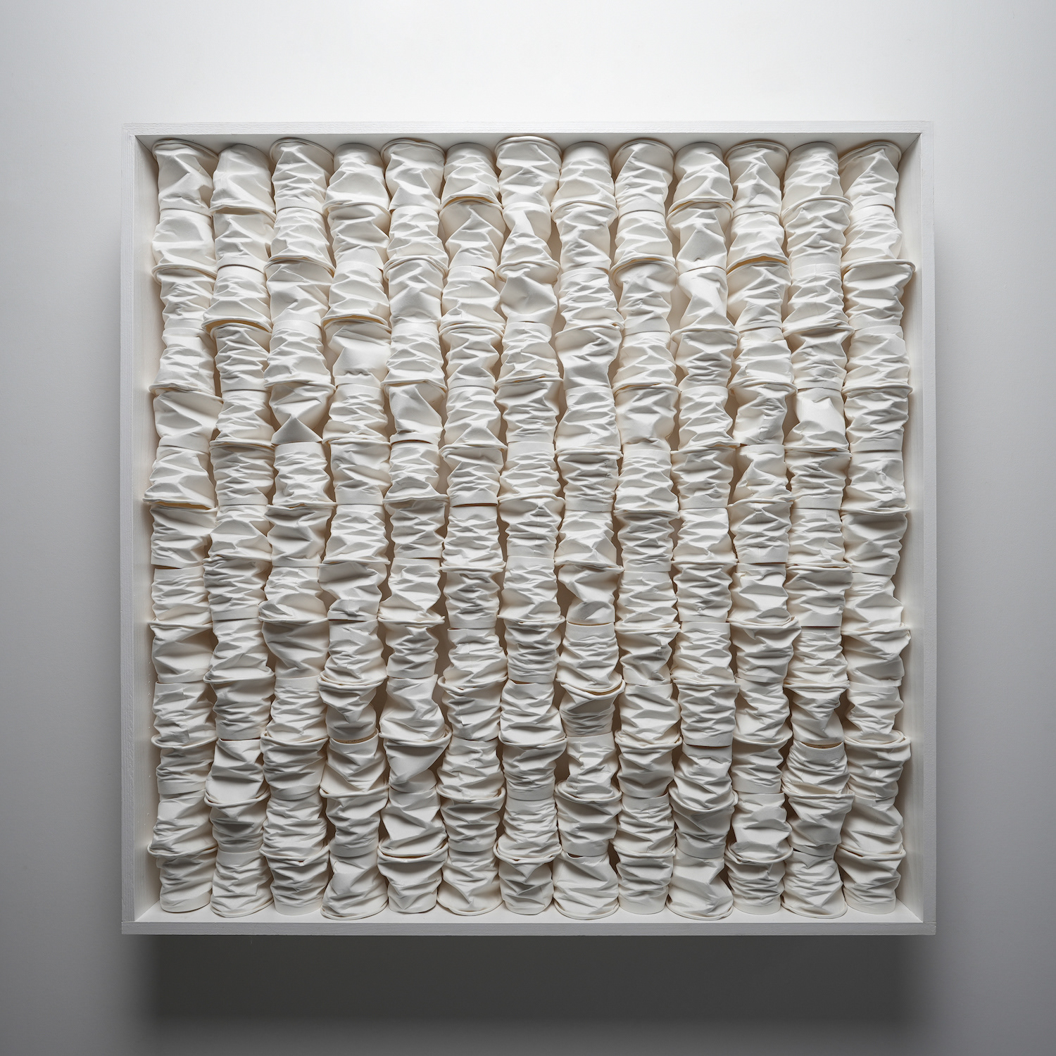 紙コップを垂直方向に圧縮して生じる偶然的なシワの表情に注目したレリーフ構成。潰した紙コップを一定の高さに戻したうえで敷き詰めることにより、不規則な構成のなかにも適度な安定感を与えている。