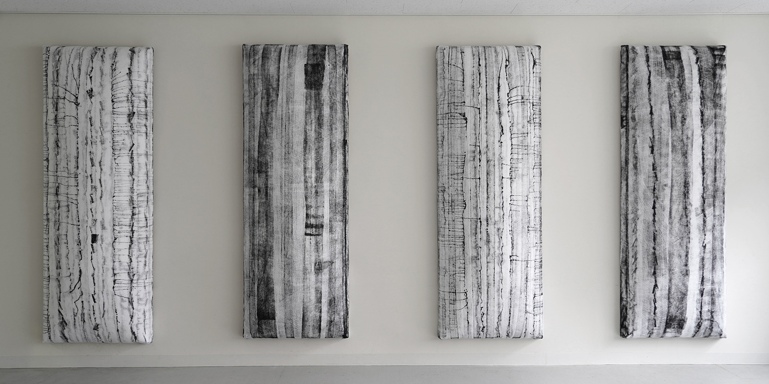修了制作 "work. 59-62" 木製パネル、綿、布、糸、ジェッソ 各240 × 90 x 30cm