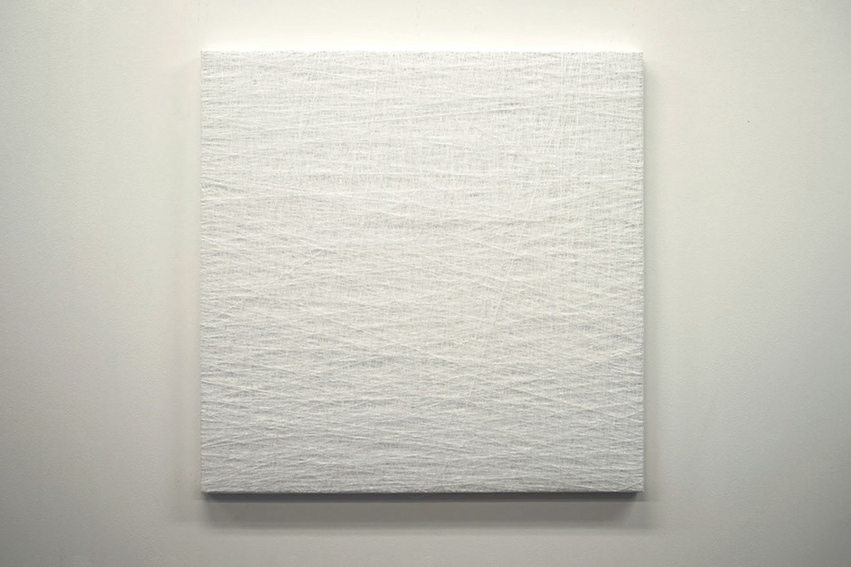 糸の重なりによる表現。ボンドを水で薄めた液を用意し、その中に糸を巻きつけた枠を沈めて引き揚げ、乾燥させることでハリのある糸の膜を得る。これを多数用意し、層状に重ねて画面を覆った。繊細なテクスチャーが作り出す複雑な起伏と糸の偶然的な連なりが心地よい視線誘導を引き起こす。