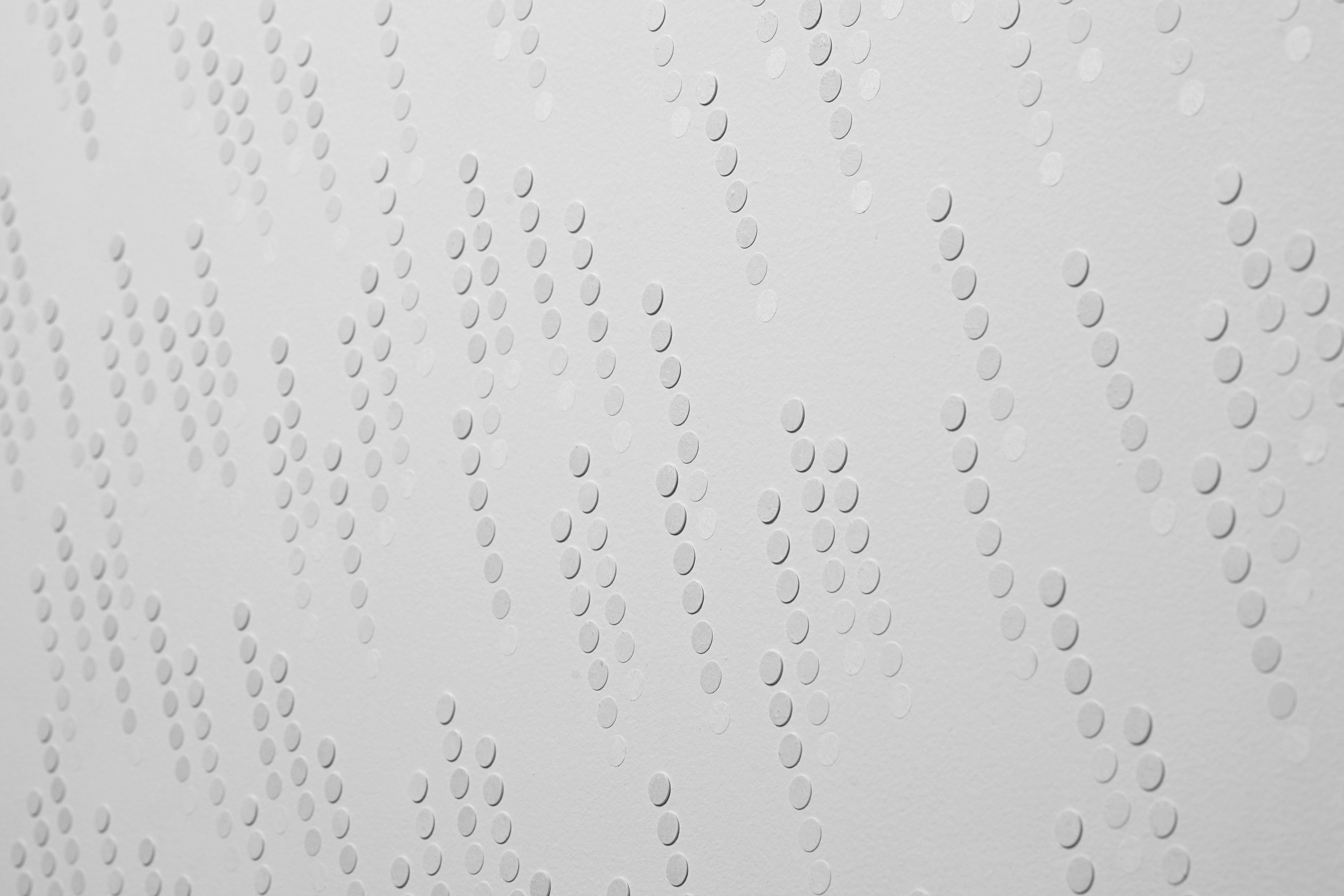 円形のラベルシールを重ねて貼り付けることにより、微細な凹凸変化を与えて繊細な影の表現を試みたレリーフ作品。点を一列に並べたユニットは、重ねの枚数が一枚ずつ減ってゆくことにより画面の奥に消失してゆくような印象を与える。