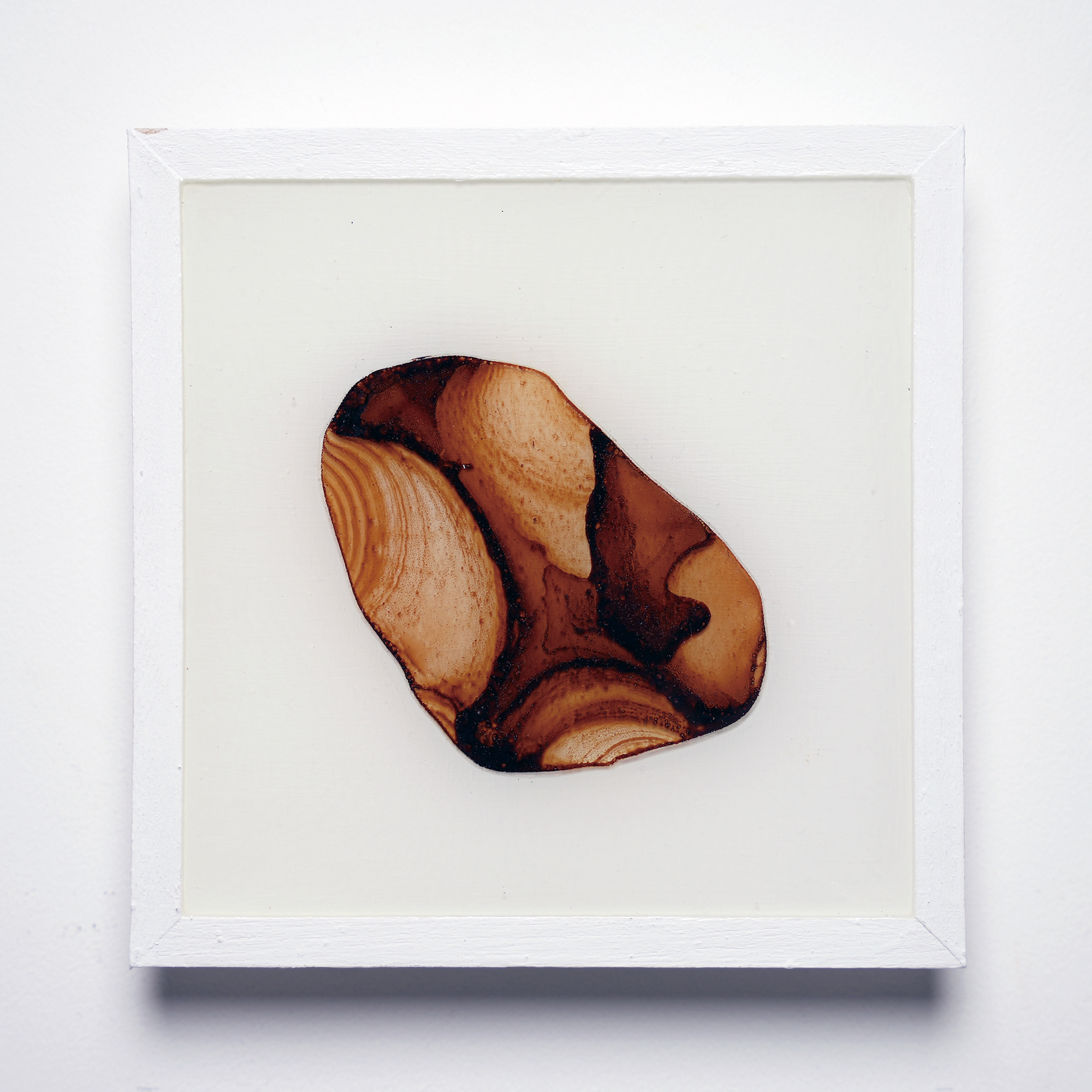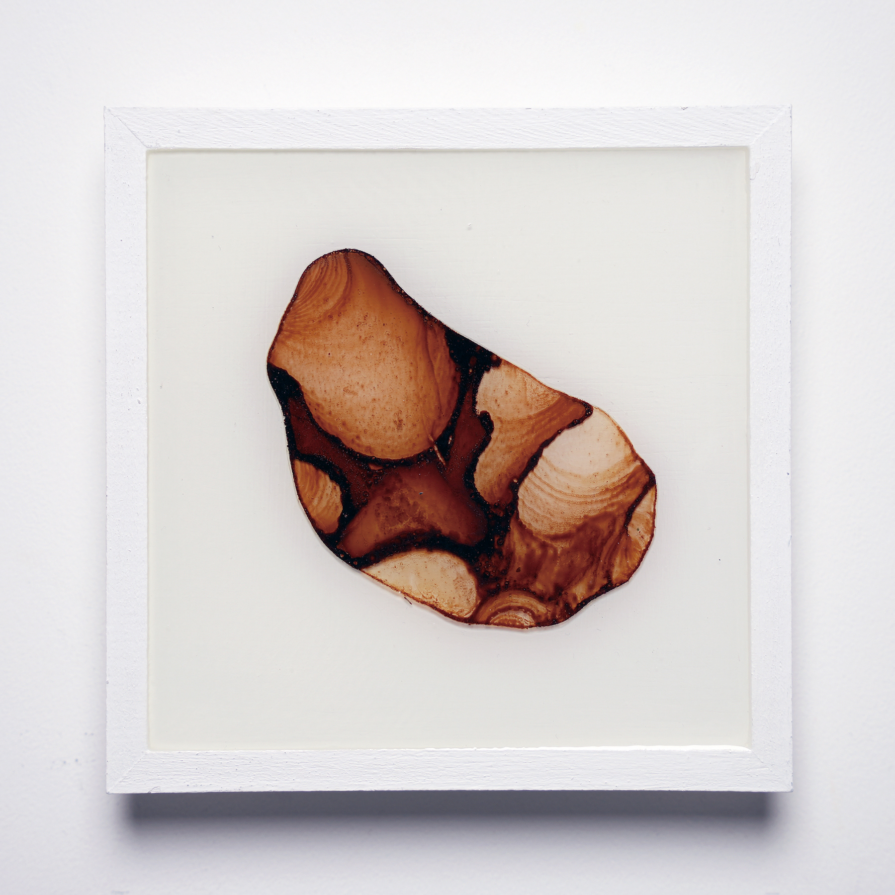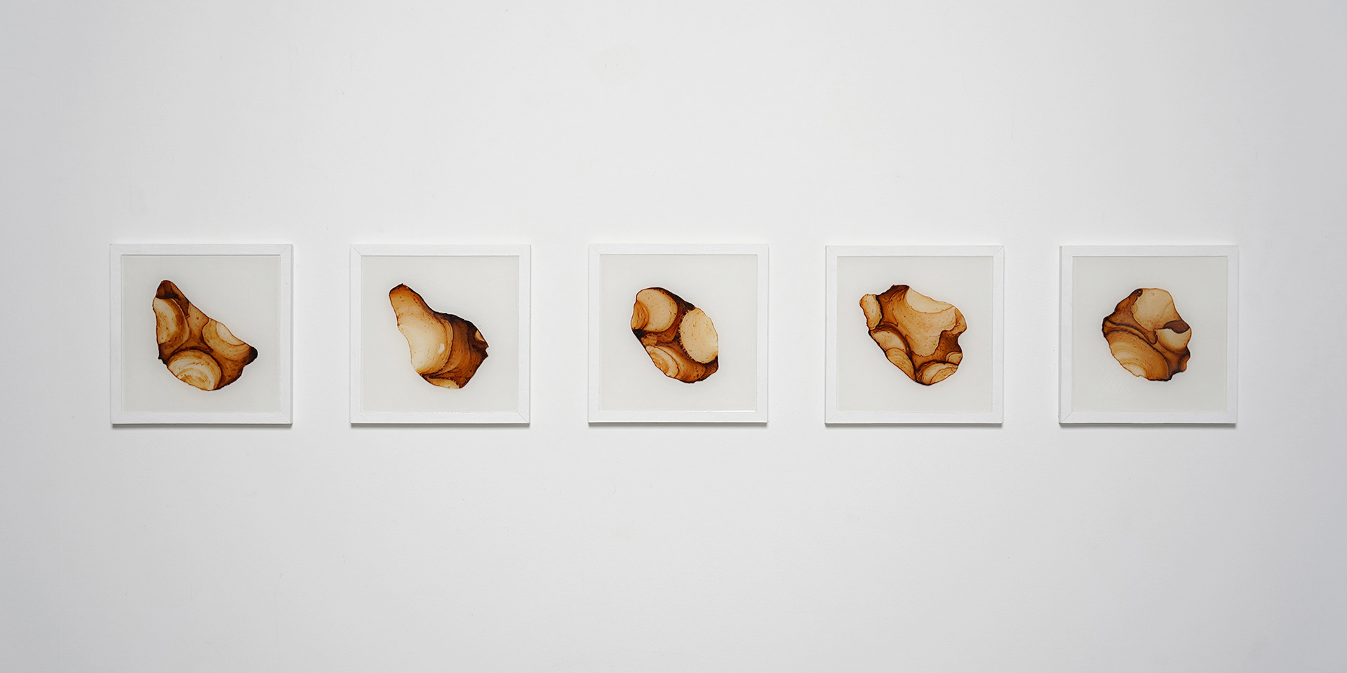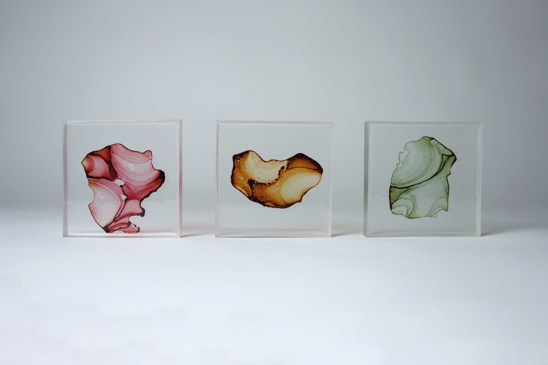 薄いプラ板に紅茶を垂らして乾燥させると、コーヒーリング効果で表面に濃淡のある模様が定着する。オーブンで焼くと収縮して密度が上がり、色合いも鮮やかになる。これをレジンに封入した作品。色の違いは扱う紅茶の種類による。正方形作品は1辺10cm。横長の作品は長辺30cm。