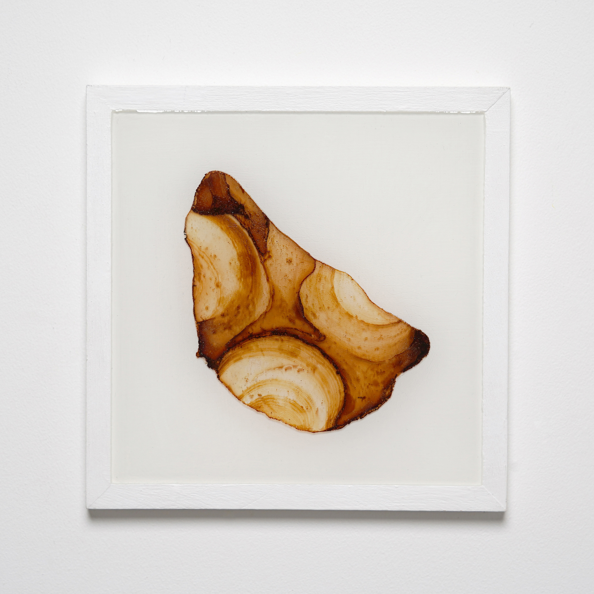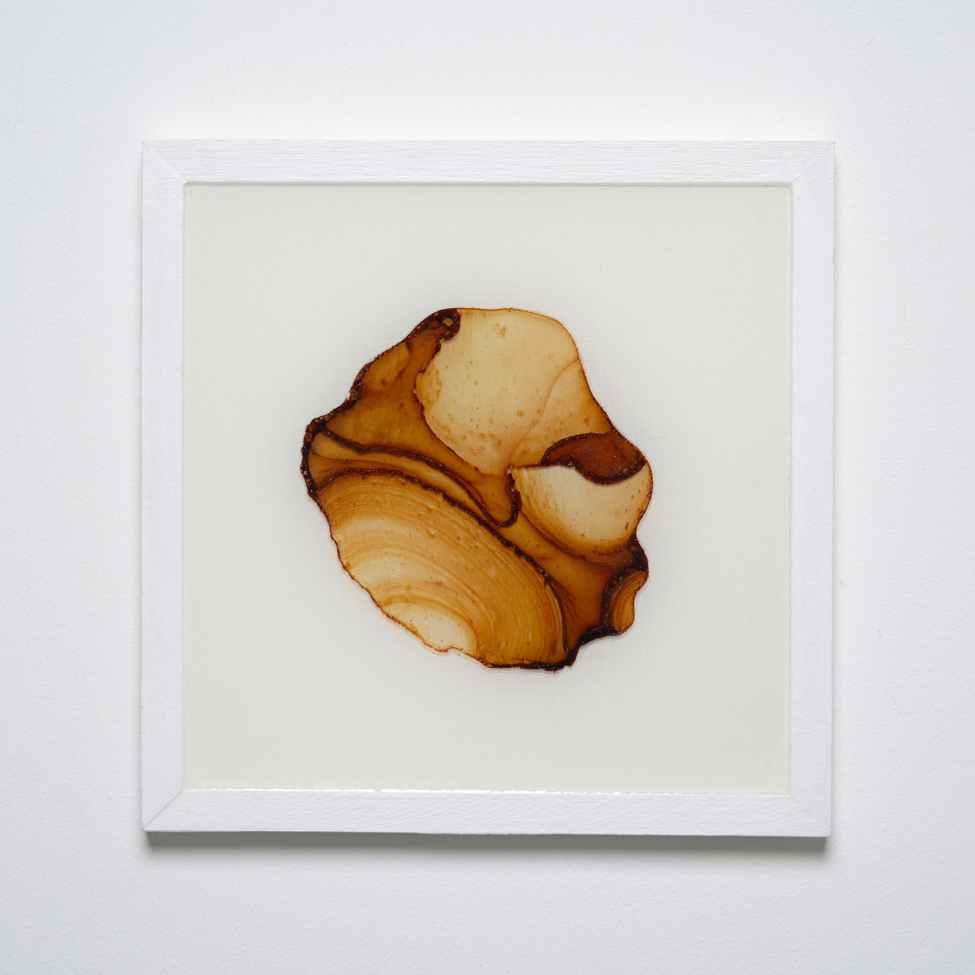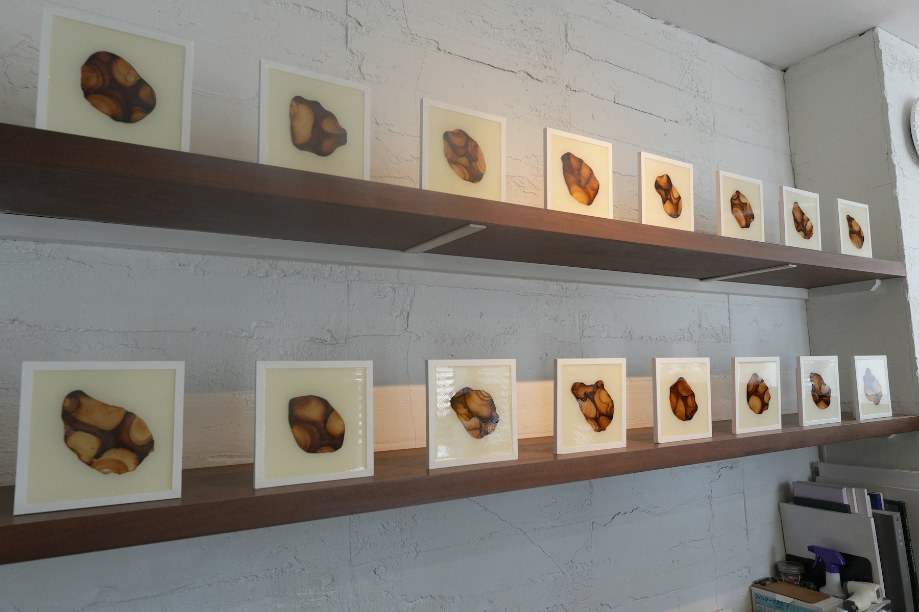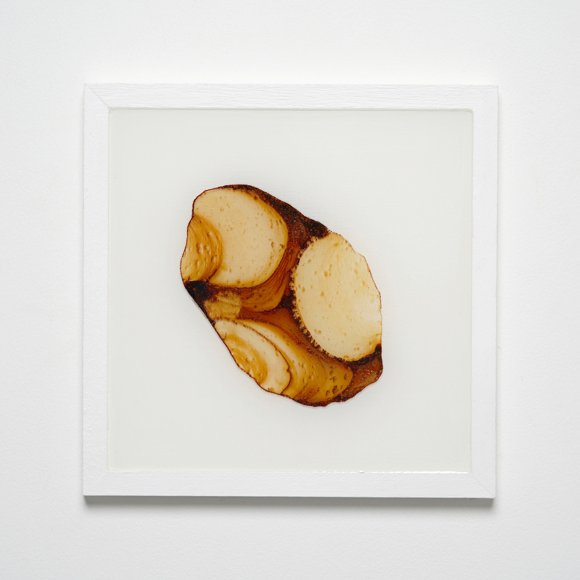 薄いプラ板に紅茶を垂らして乾燥させると、コーヒーリング効果で表面に濃淡のある模様が定着する。オーブンで焼くと収縮して密度が上がり、色合いも鮮やかになる。これをレジンに封入した作品。色の違いは扱う紅茶の種類による。正方形作品は1辺10cm。横長の作品は長辺30cm。