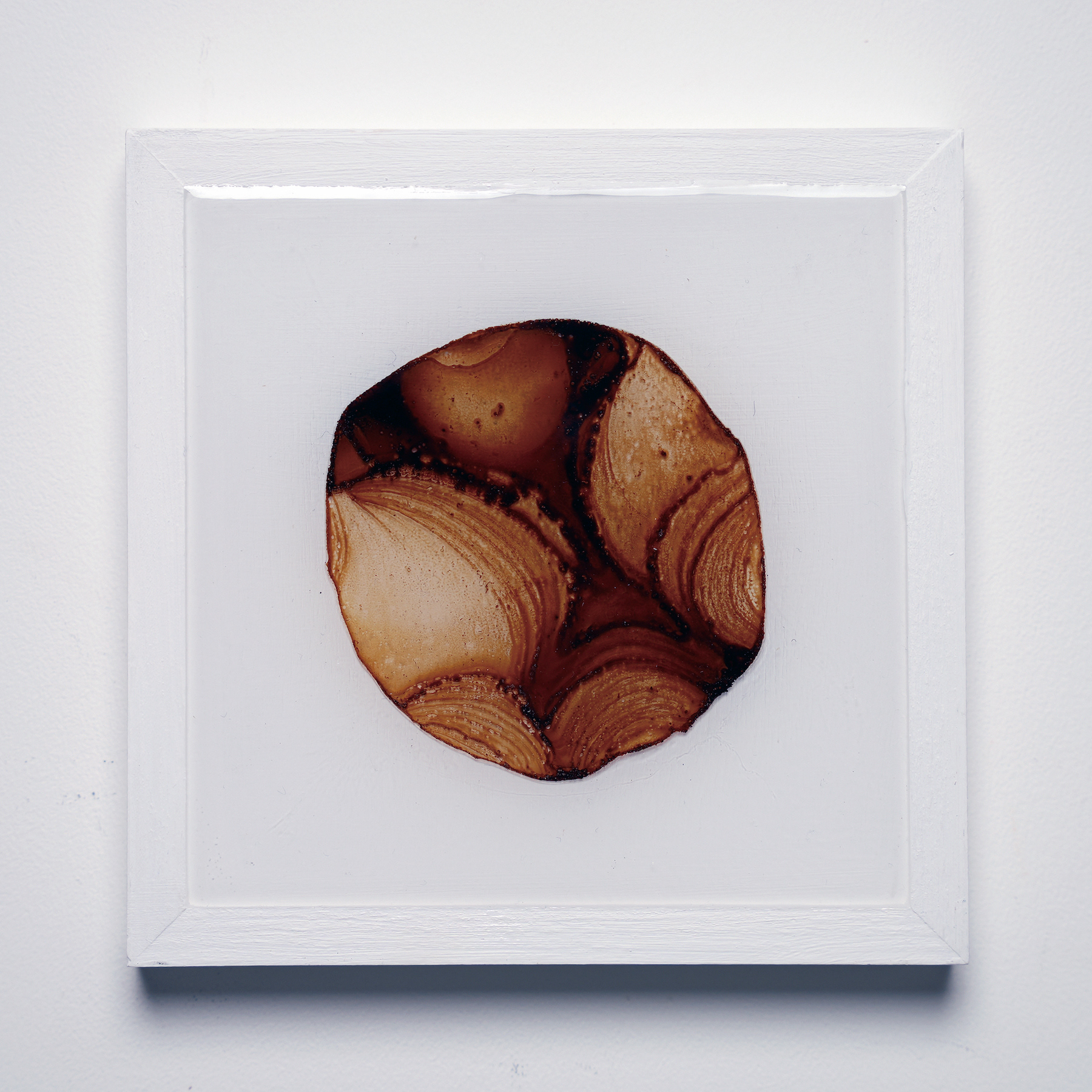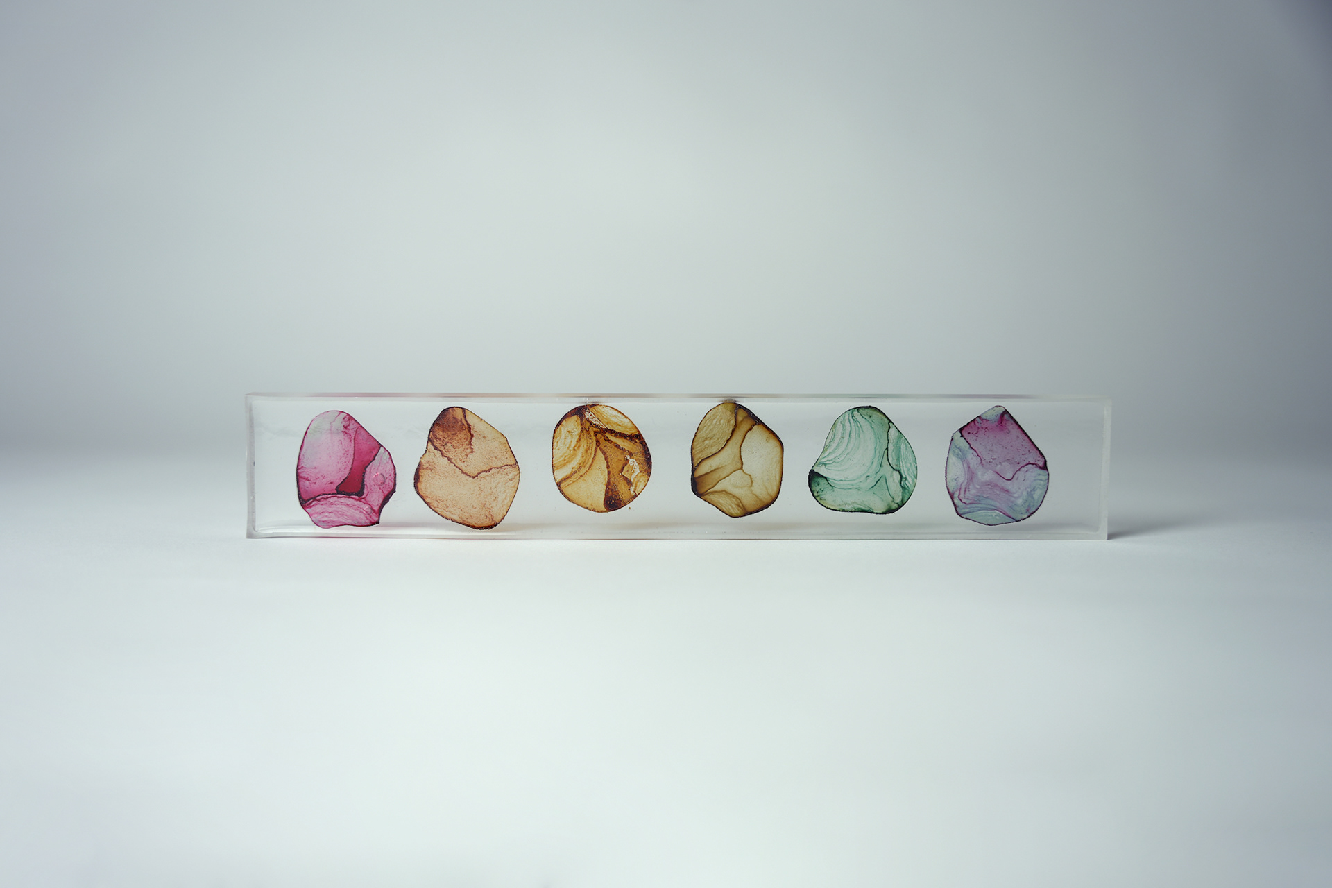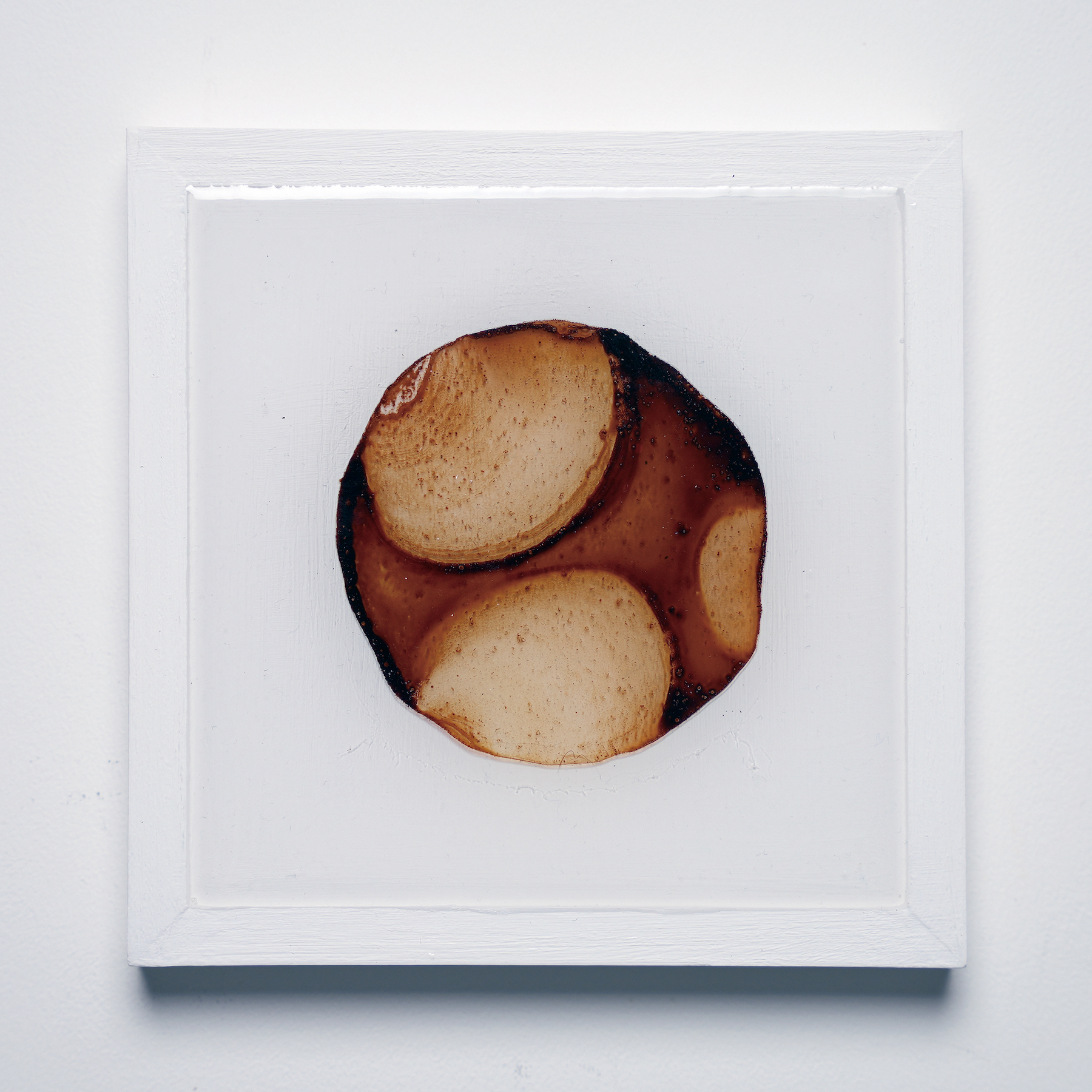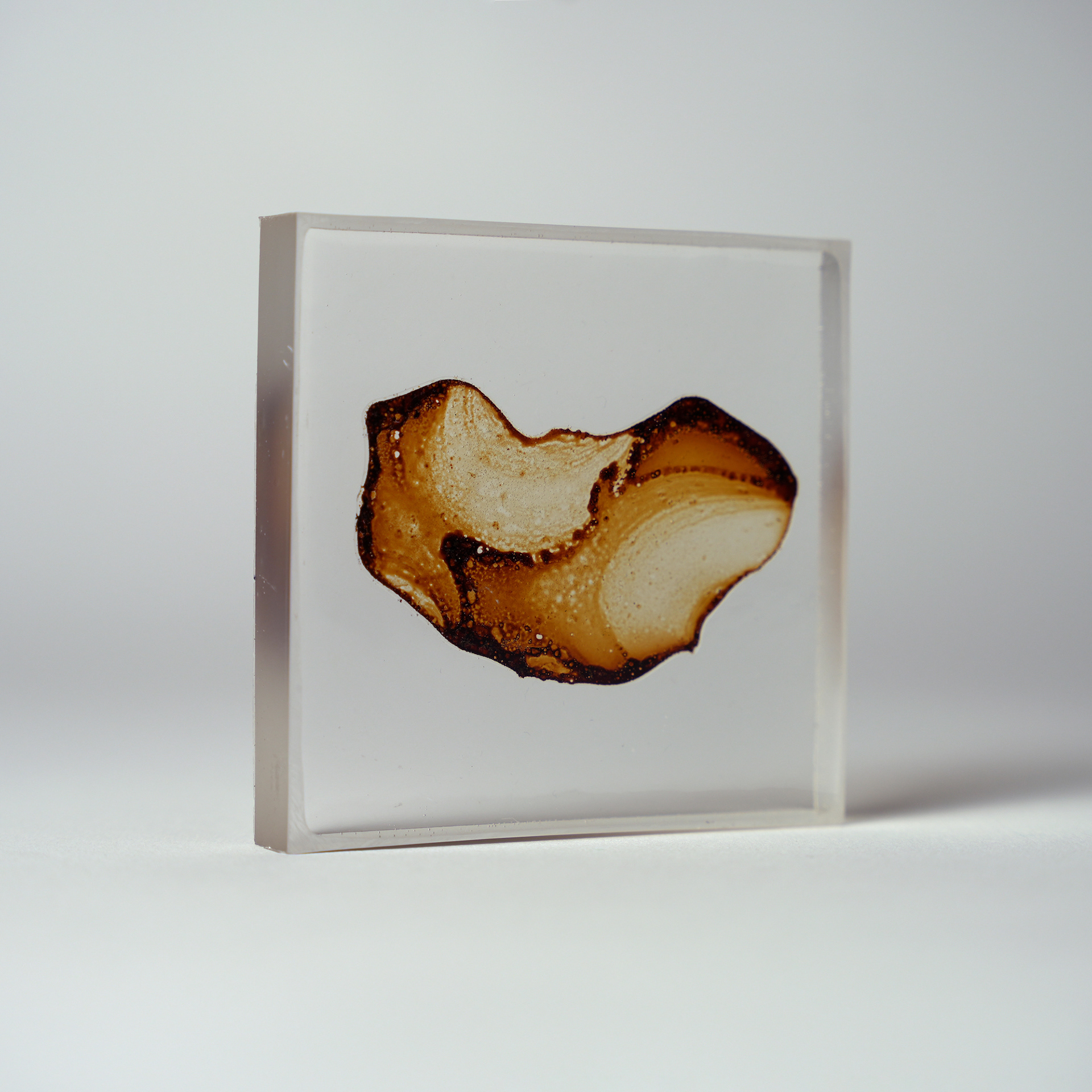 プラ板に紅茶を垂らして乾燥させ、オーブンで焼いたものをレジンで封入したシリーズ。収縮により密度が上がり、濃淡が強調される。紅茶の種類により色も変わる。
