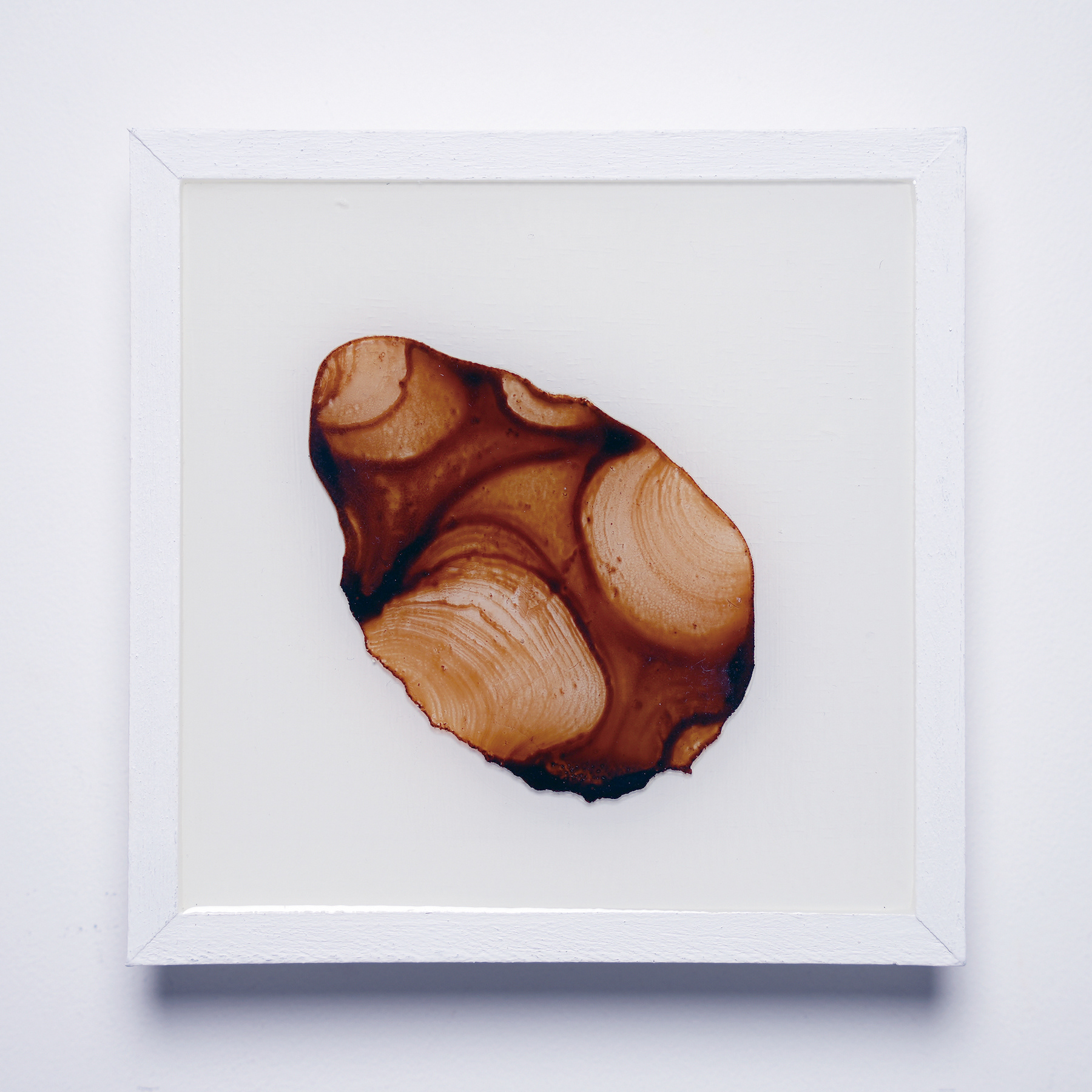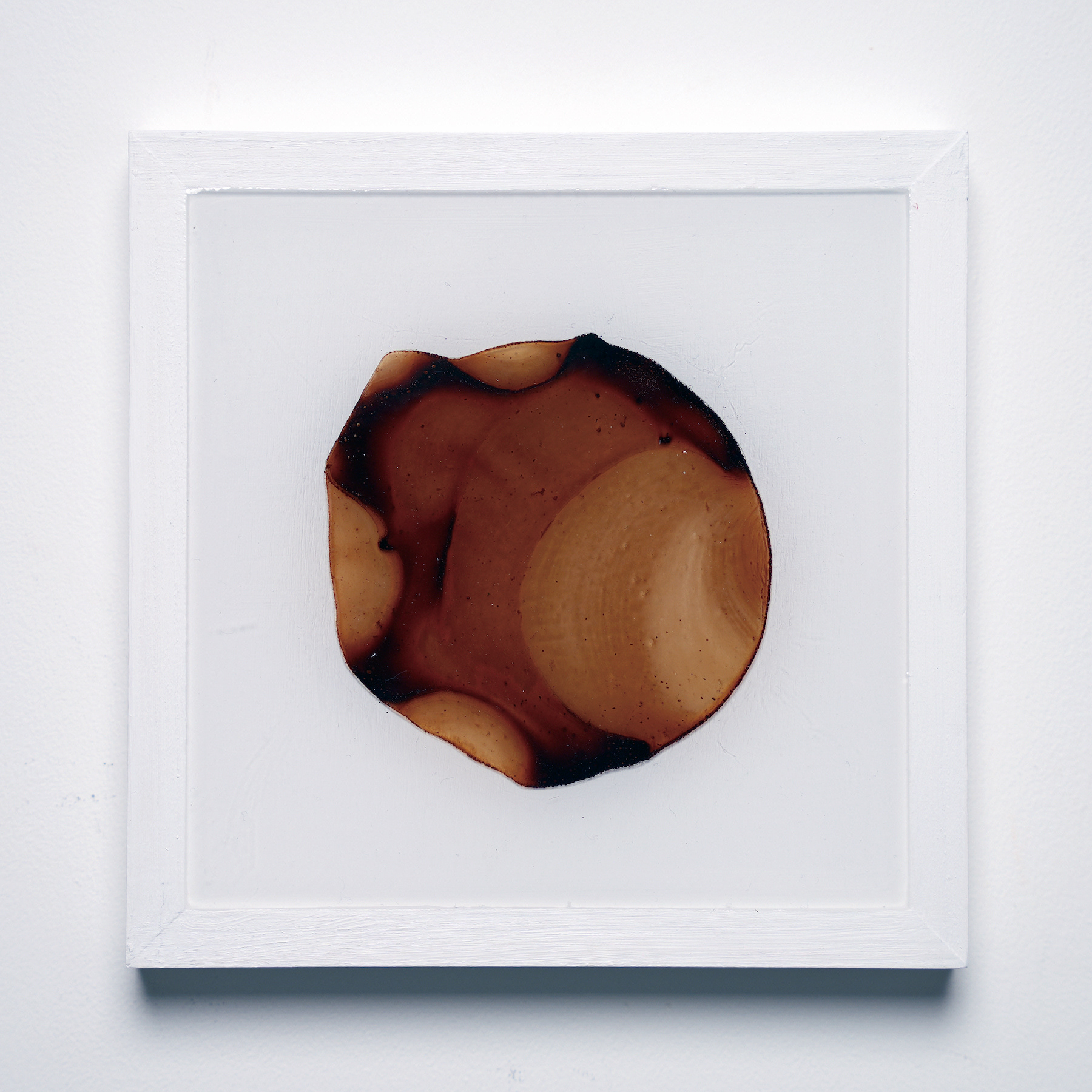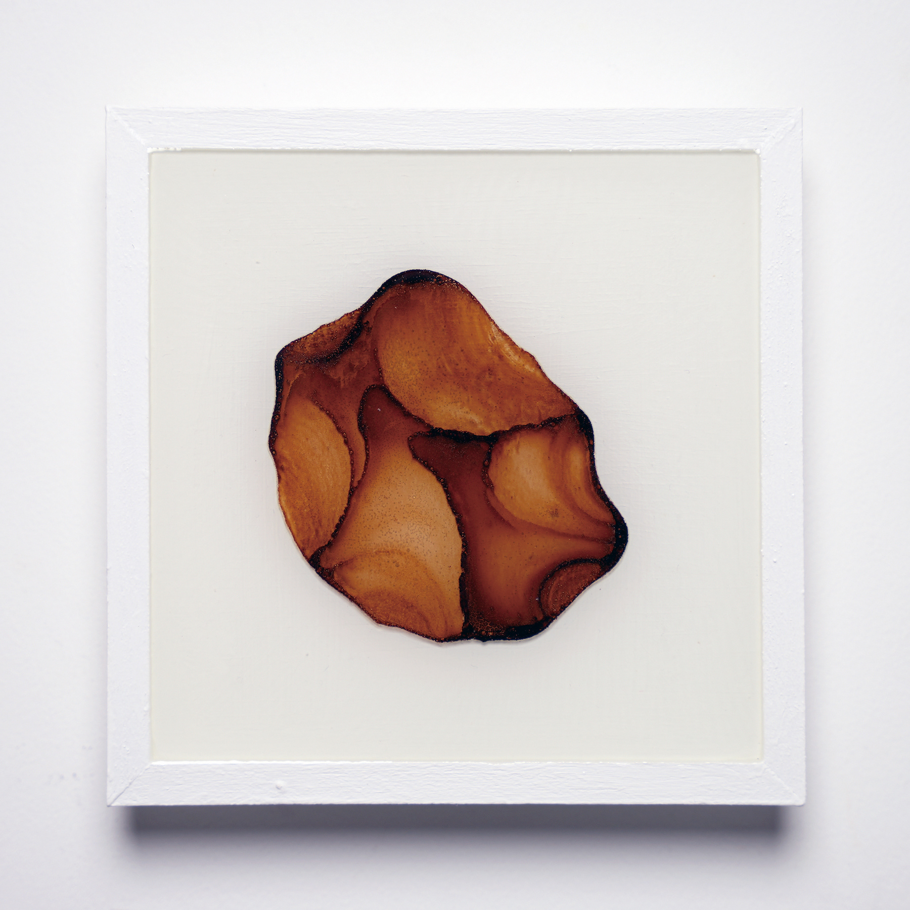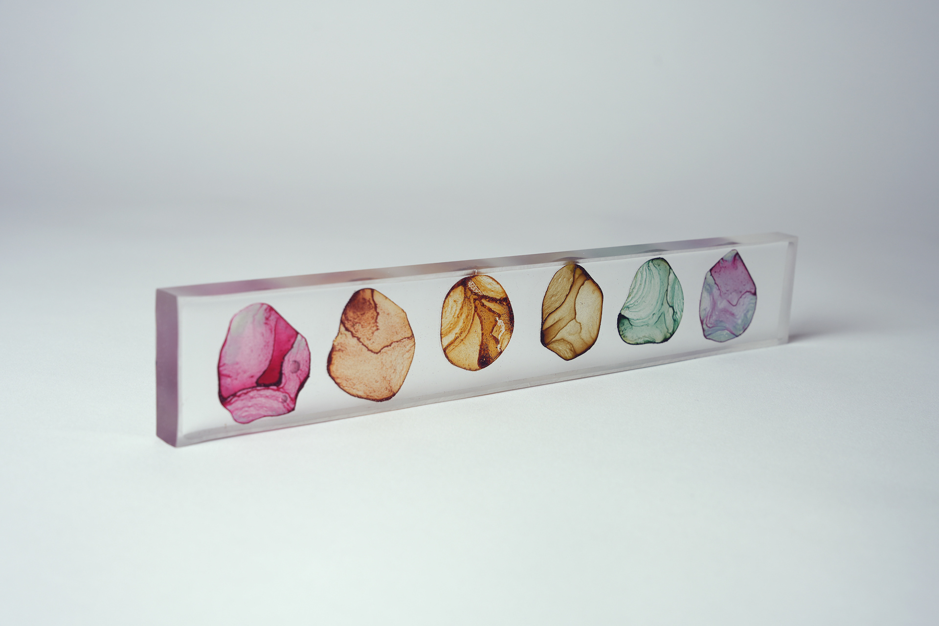 プラ板に紅茶を垂らして乾燥させ、オーブンで焼いたものをレジンで封入したシリーズ。収縮により密度が上がり、濃淡が強調される。紅茶の種類により色も変わる。