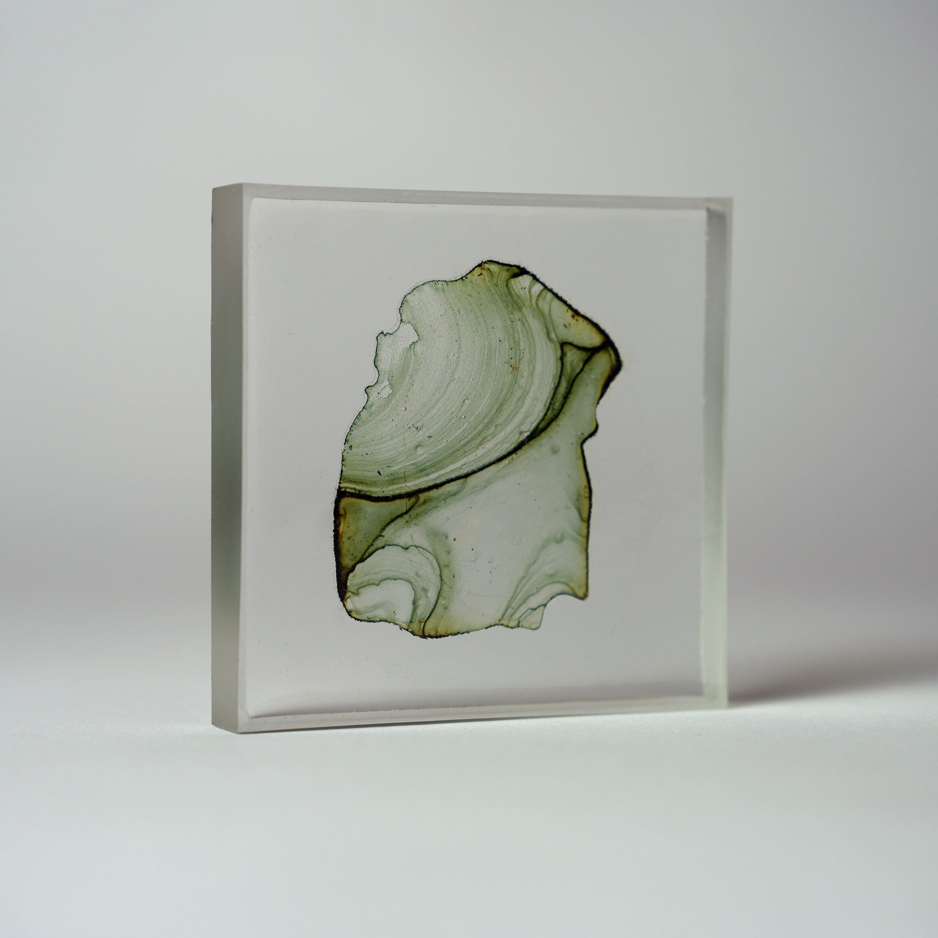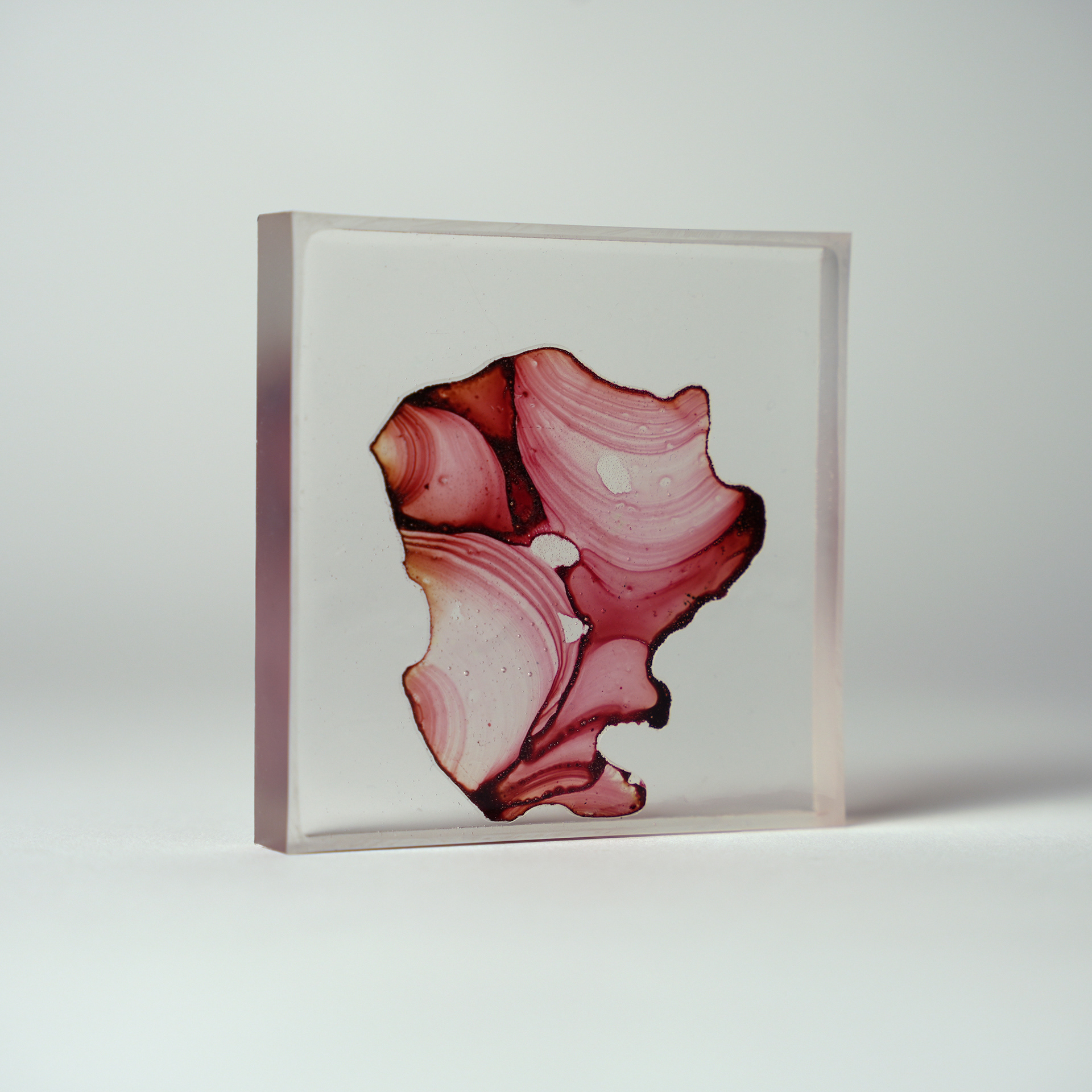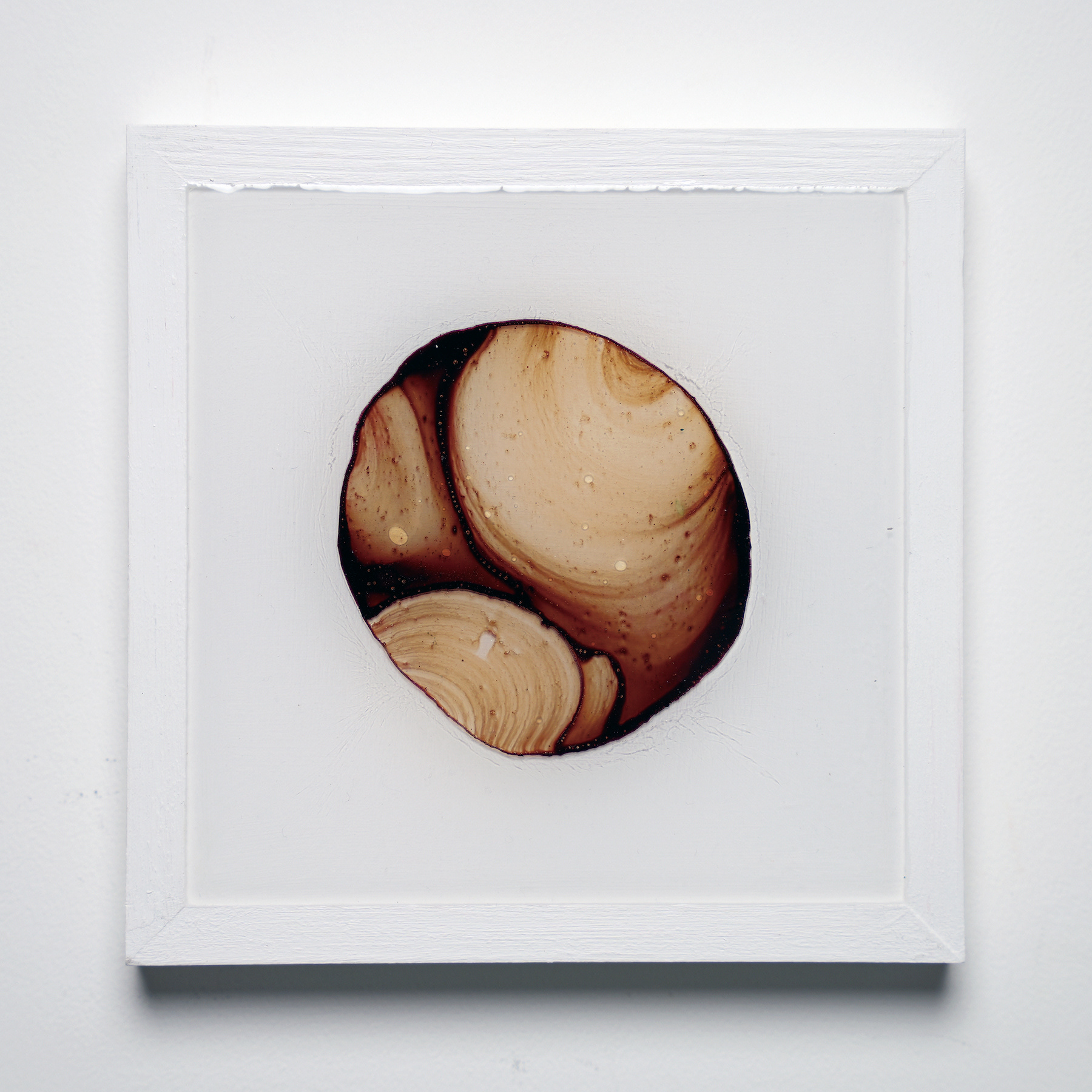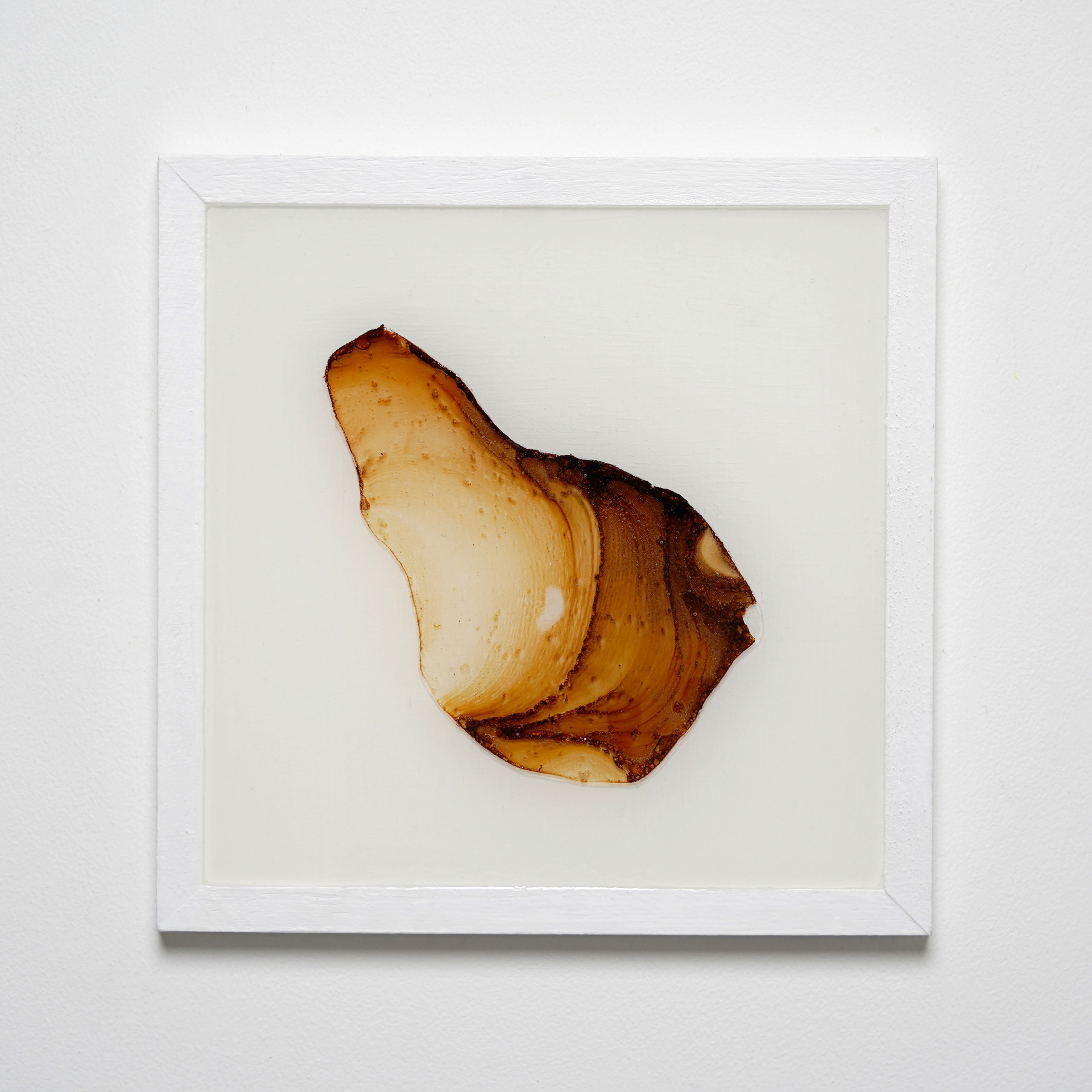 プラ板に紅茶を垂らして乾燥させ、オーブンで焼いたものをレジンで封入したシリーズ。収縮により密度が上がり、濃淡が強調される。紅茶の種類により色も変わる。