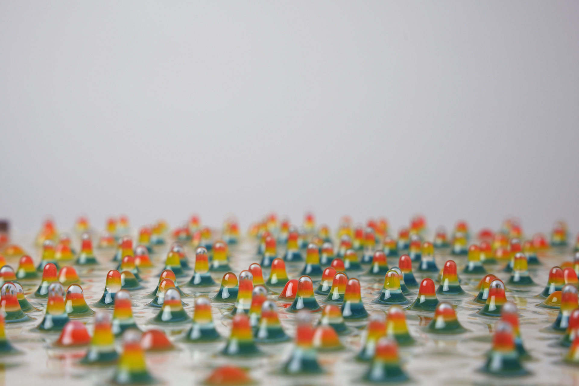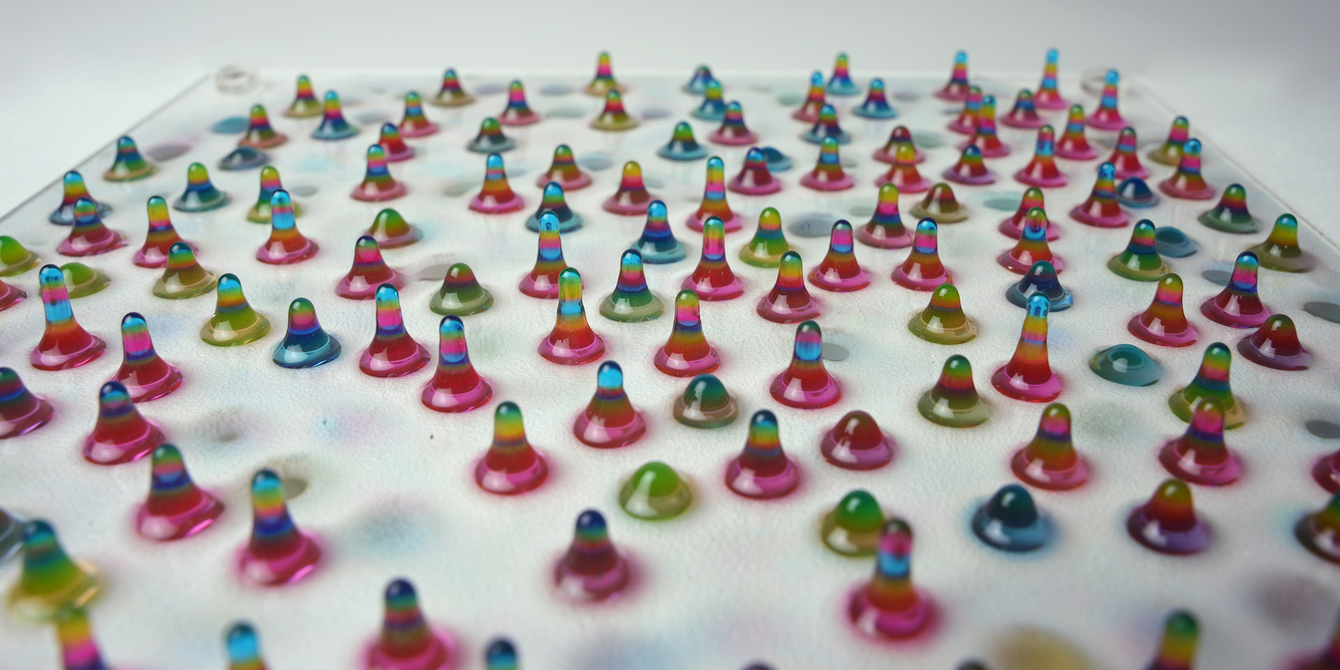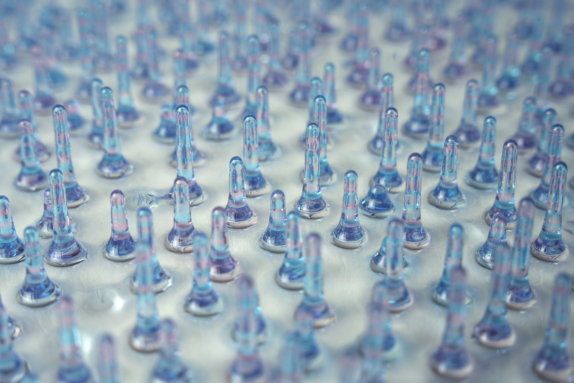 水平に置いたアクリル板に着色したエポキシ樹脂を薄く塗りつけてから裏返し、逆さにして固まるまで待つ。固まったらオモテに返して今度は異なる色の樹脂を塗りつけ、再度裏返して固まるまで待つ。これを地道に繰り返してツララ状に成長させた作品。青いツララは高さ2.5cmほど。