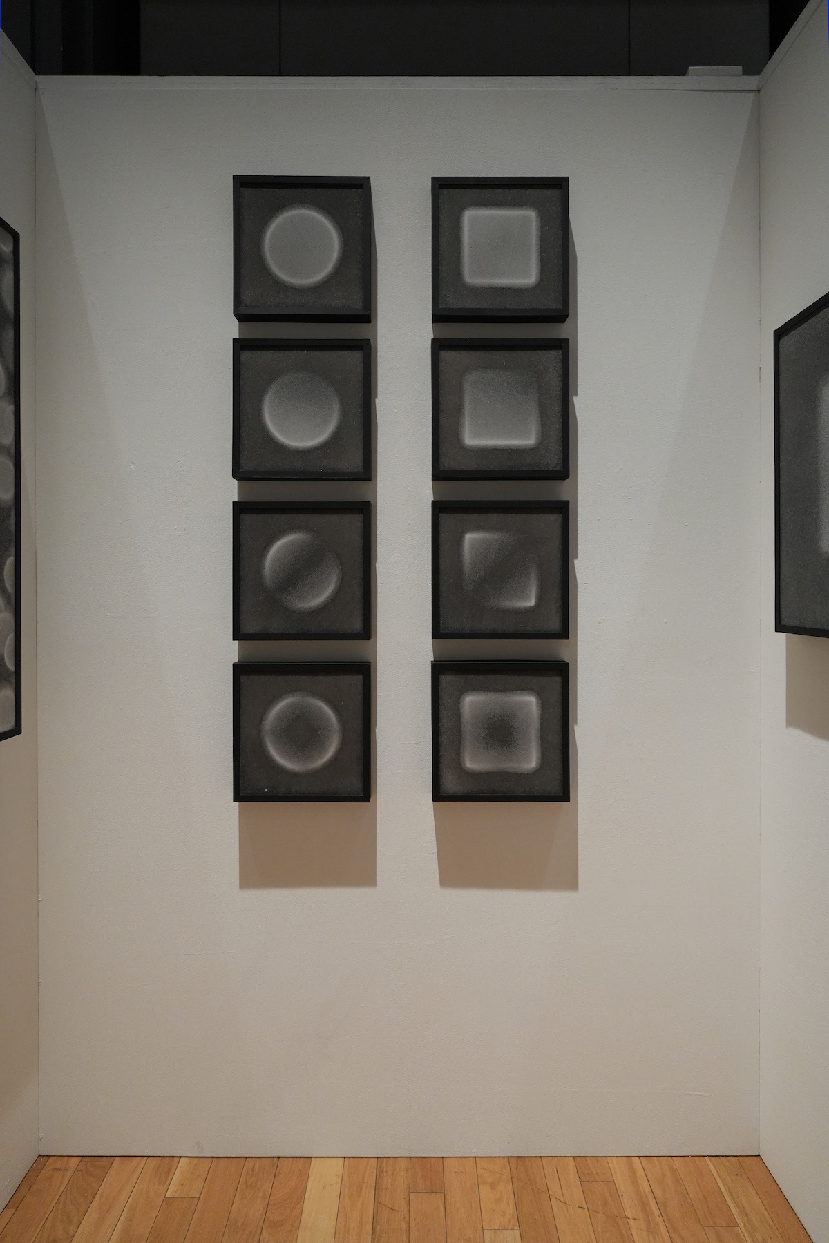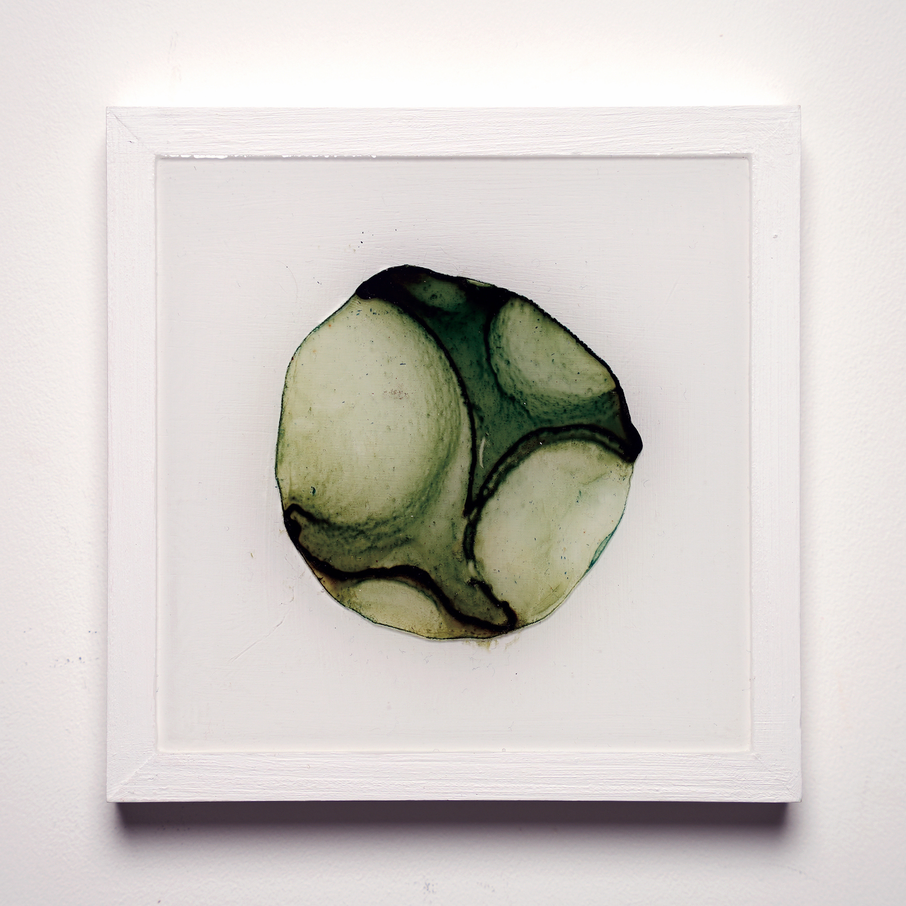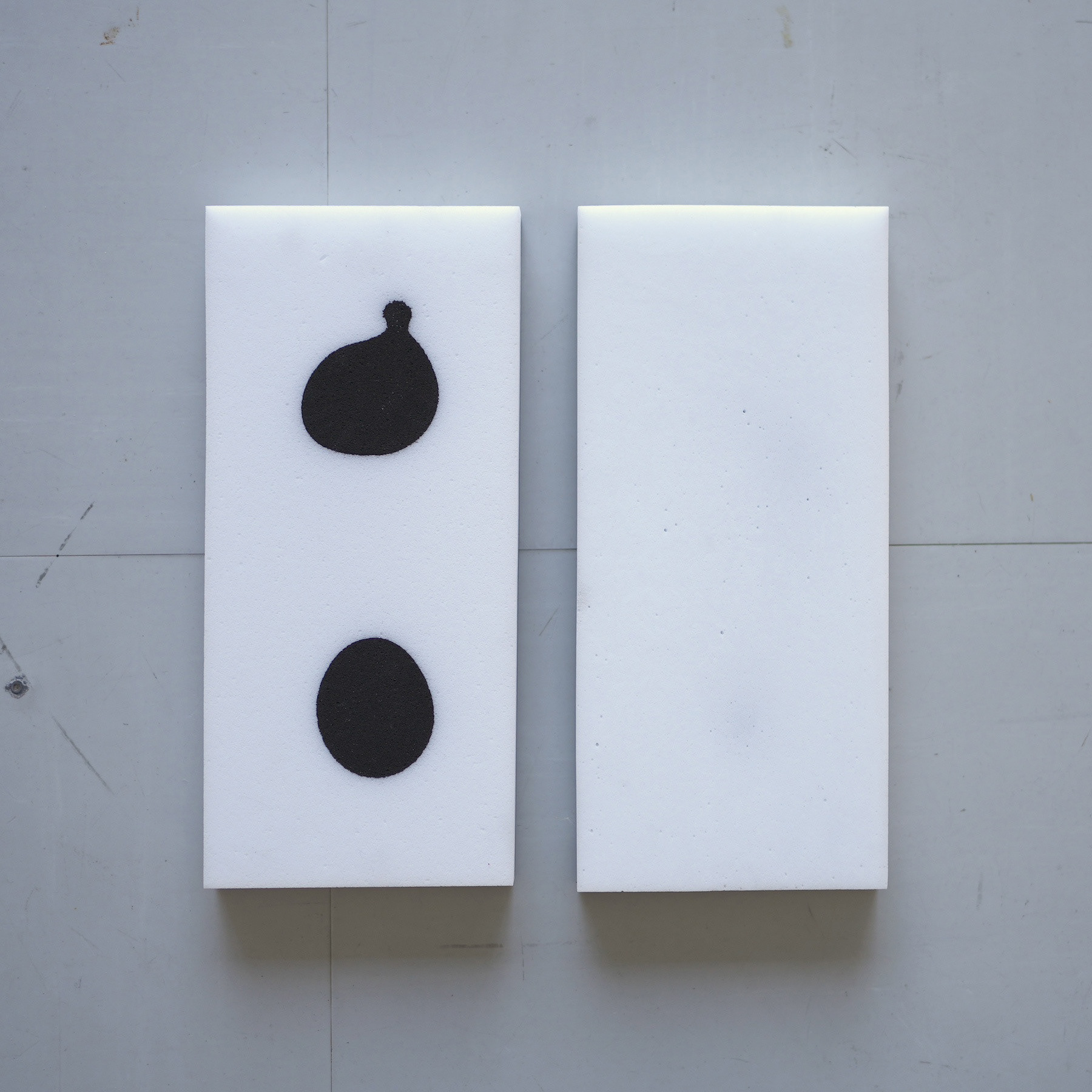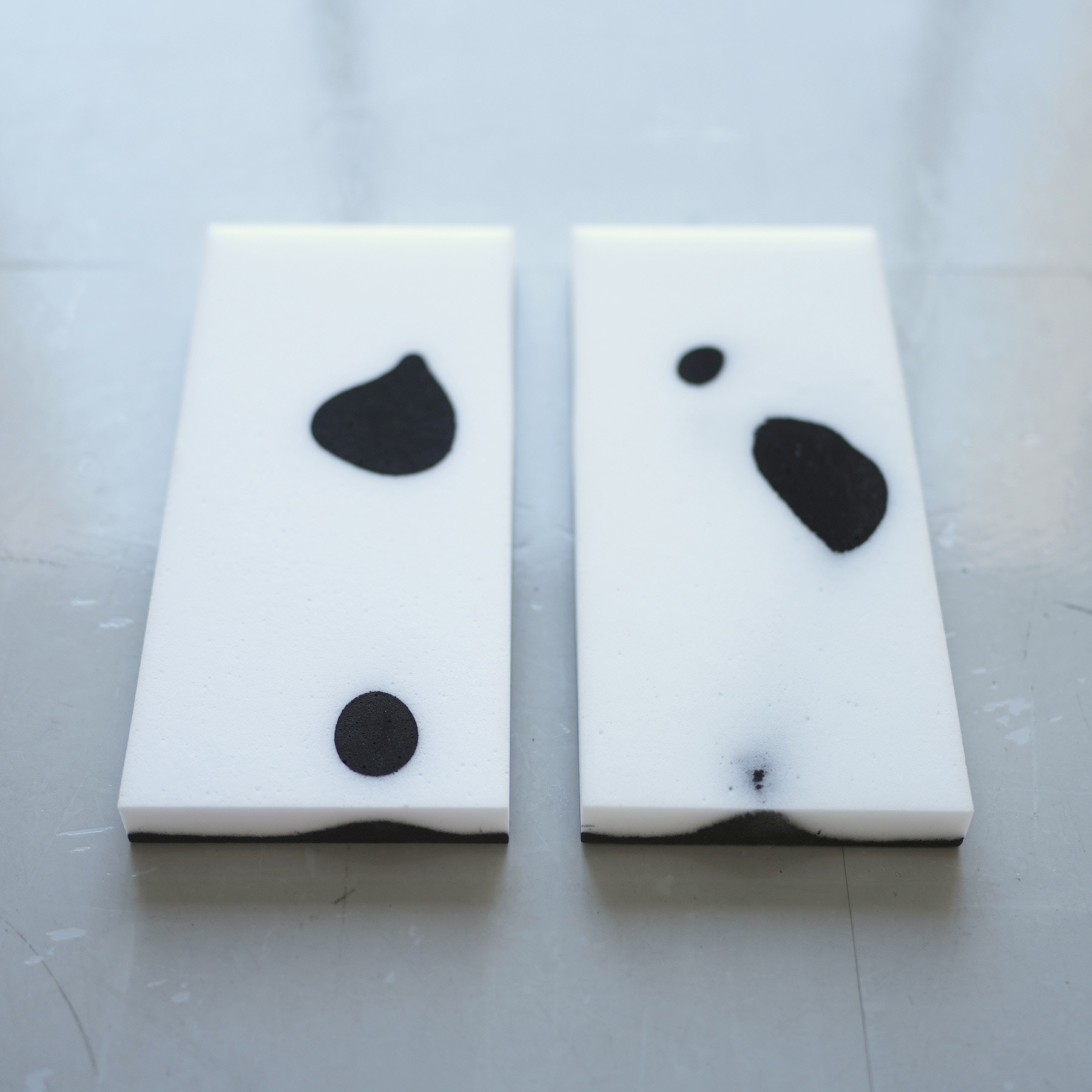 樹脂のプールにメラミンスポンジを浸した状態で、幾何形体の型枠を鉛直方向に押し付けた。同じ型枠でも圧力をかける位置を変えることで樹脂の浸透具合が変化し、濃淡に変化が生まれる。
