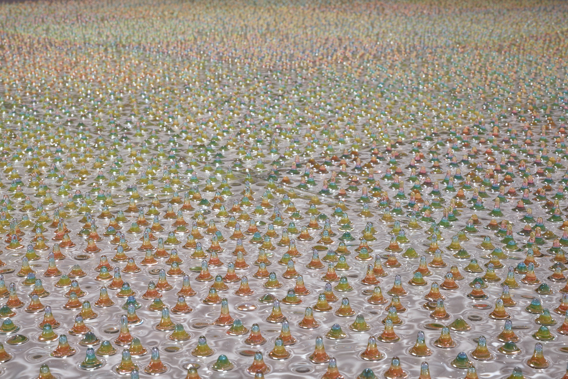 アクリル板の表面にエポキシ樹脂を薄く塗り、逆さにして雫が垂れる状態を維持する。硬化したら板を裏返して元に戻し、わずかに起伏が生じた表面にもう一度エポキシ樹脂を塗って、再度逆さにして硬化させる。このプロセスを繰り返すことで徐々に起伏を成長させ、丸みを帯びた突起が無秩序に分布する表面を形成した。