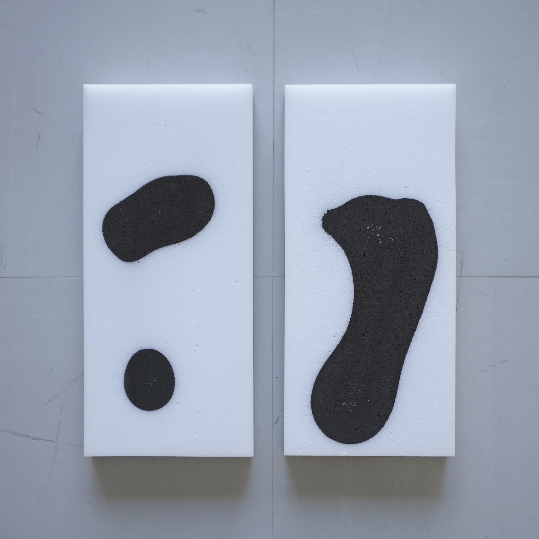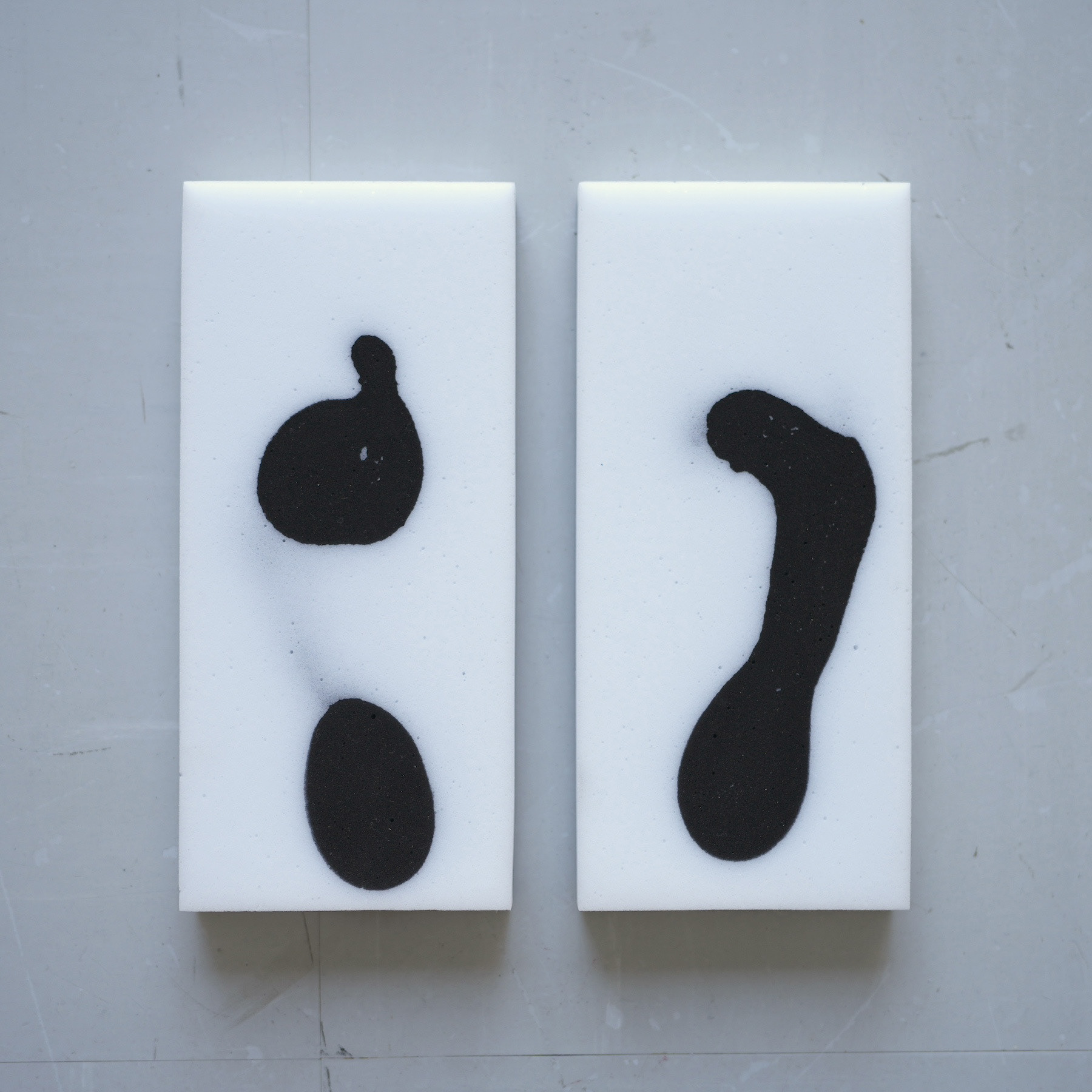 墨汁を溜めたトレイにメラミンスポンジを2つ浸し、この上に両足で10秒間立つ。圧力がかかっている箇所だけ墨汁が表面まで吸い上げられ、足の裏の形が部分的にプリントされる。直立しても人によって体重のかけ方が異なるため、自然とそれぞれ違う模様が生まれる。