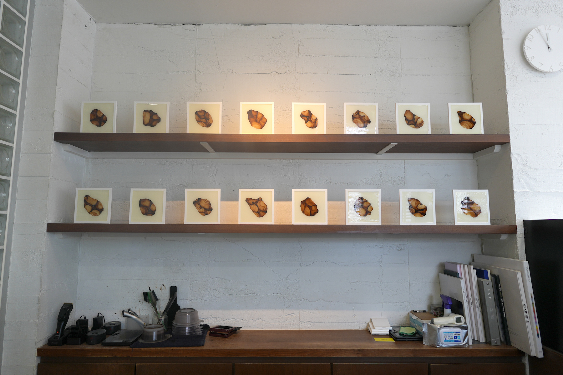 薄いプラ板に紅茶を垂らして乾燥させると、コーヒーリング効果で表面に濃淡のある模様が定着する。これをオーブンで焼くと収縮して密度が上がり、濃淡がさらに強調される。同種の紅茶を使った27点組作品。